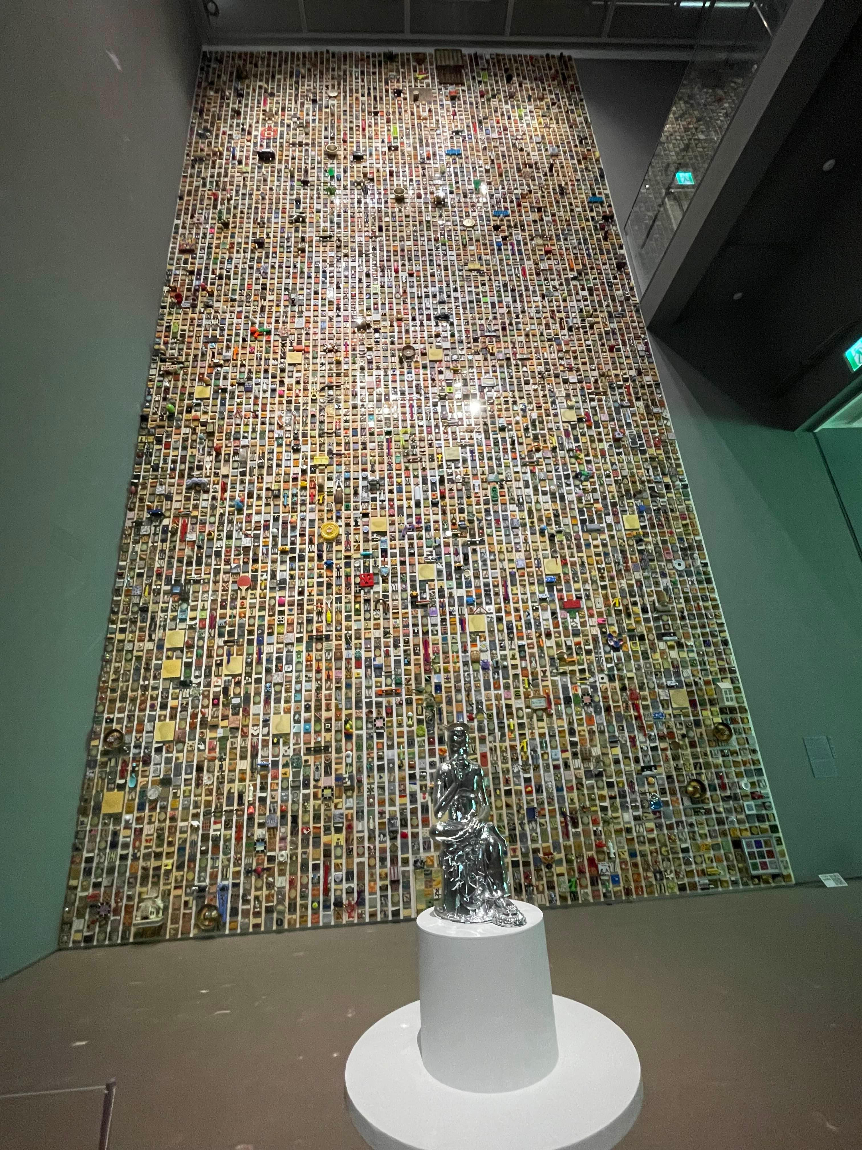 가로세로3인치 캔버스에 그리거나 붙인 작품 약 만 점을 붙여서 만든 벽. 그 앞에 메탈반가사유상(?)